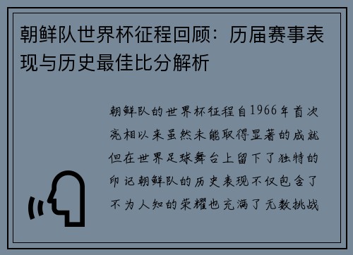 朝鲜队世界杯征程回顾:历届赛事表现与历史最佳比分解析